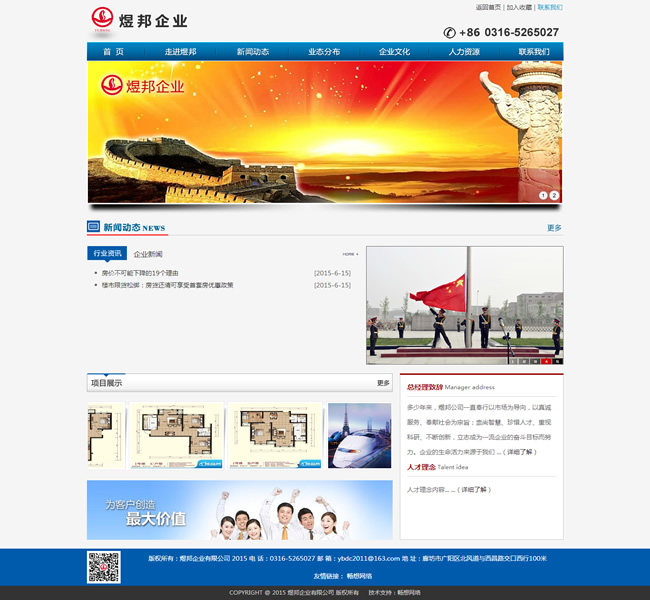 煜邦企業(yè)創(chuàng)建于2001年,公司坐落于京津走廊上的明珠城市——廊坊市,位于西昌路與北鳳道交叉口150米處。目前公司旗下有廊坊市煜邦房地產(chǎn)開發(fā)有限公司、廊坊市煜邦電力工程設備有限責任公司,廊坊市容益祥擔保有限公司、廊坊市管家物業(yè)服務有限公司、廊坊市廣陽區(qū)尖塔同德柴雞養(yǎng)殖場、廊坊市琦強建筑機械租賃有限公司等六家公司,形成了以電力工程、地產(chǎn)開發(fā)為主,以物業(yè)服務、養(yǎng)殖、金融擔保、租賃為輔的多元化產(chǎn)業(yè)格局。